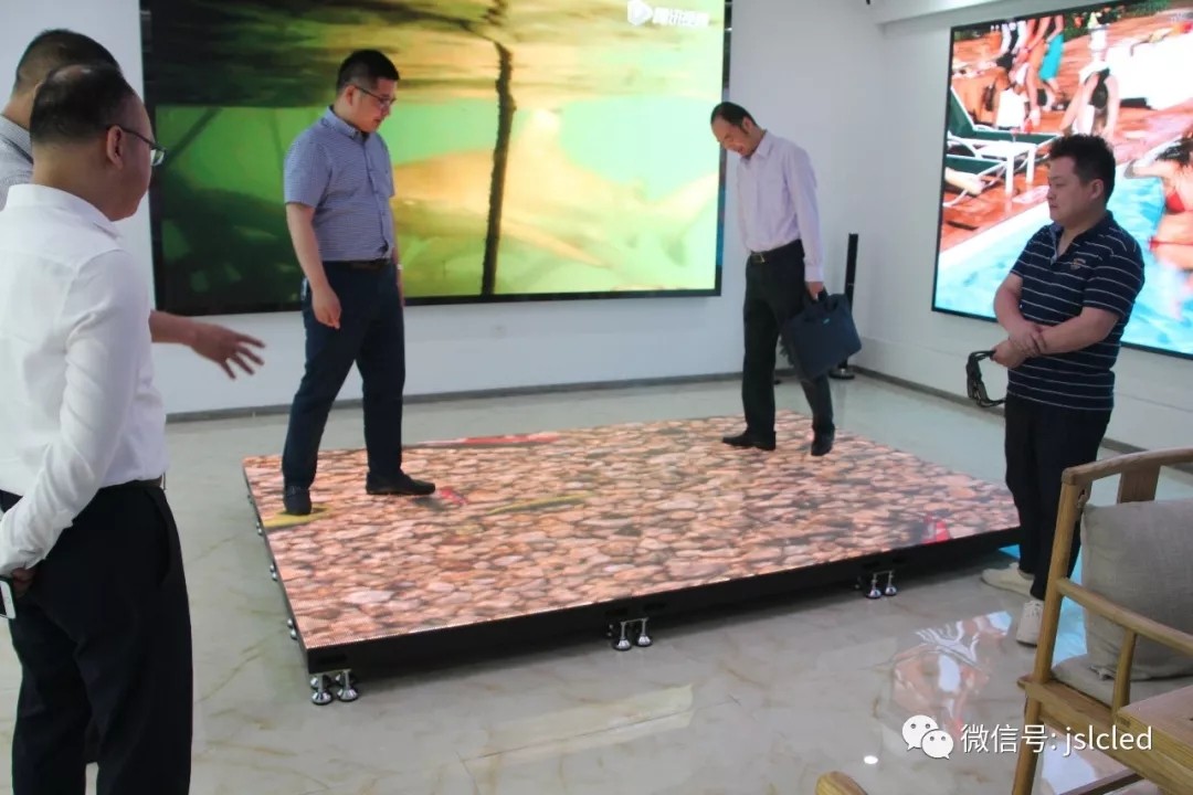 Chapter nine yu, general manager to the leaders introduced the exhibition hall of LED display products, on-site to experience with 3 d screen, screen AR, floor tile, screen and so on.