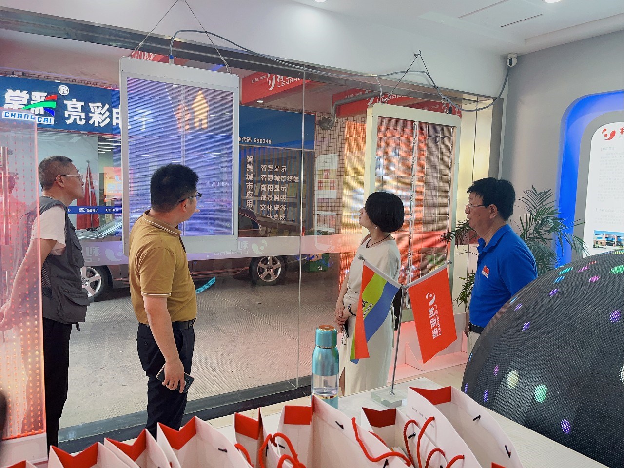 步入展廳,章總向各位領(lǐng)導(dǎo)介紹了LED顯示特色產(chǎn)品,如135寸會(huì)議一體機(jī)、球形屏、地磚互動(dòng)屏、3D屏等,包含多類不同的應(yīng)用場景。