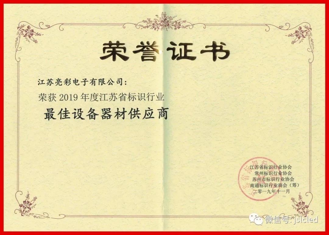 在這次盛會(huì)上,榮獲"2019年度江蘇省標(biāo)識(shí)行業(yè)最佳設(shè)備供應(yīng)商"。這是江蘇亮彩公司的光榮,感謝協(xié)會(huì)對(duì)我司的認(rèn)可,以此為今后工作更大的動(dòng)力,更好地為協(xié)會(huì)和廣大客戶服務(wù)!